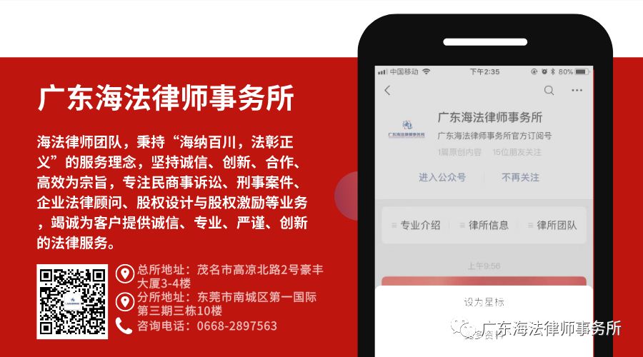 -关于我们-广东海法律条文师事务所(以下简称“海法”)是由广东省民事厅核准设立的律师事务所。作为一家立足广东、面向全国不同行业客户的综合性专业法律条文服务机构,海法自创建以来,秉持一贯的稳健和敬业精神,伴随中国社会经济的腾飞,在协助众多客户走向成功的同时,自身也得到跨越式发展。海法于2007年在东莞市开办了分支机构——广东海法(东莞)律师事务所。海法先后获得广东省优秀律师事务所、广东省律师行业先进党组织机构等荣誉称号。